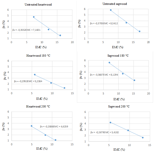 (1)The linear shrinkages in the tangential (βT), radial (βR), and longitudinal (βL) directions were calculated in percentage. Volumetric shrinkage was estimated as the sum of these three directional measurements (βV involves the product βT x βR in order to achieve sufficient accuracy within the range of βT and βR values normally found for wood, as described by Skaar (2012)) (Equation 2 ). Shrinkages of untreated and thermally-treated woods were obtained for all EMCs.