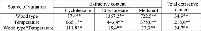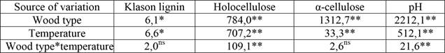 (3)Statistical analyses were done with a STATISTIC 10.0 software. Analysis of variance (ANOVA) and Tukey’s tests (at 0,01 of the probability level) were used to verify the effects of the wood type (heartwood and sapwood) and temperature (control or untreated and treated at 180 °C, and 200 °C) on the extractives, Klason lignin, hemicellulose, and α-cellulose contents, pH, EMC, and shrinkage components (βT, βR, βL, and βV). The normality and homogeneity of variance were verified by the Shapiro-Wilk and Levene’s tests.