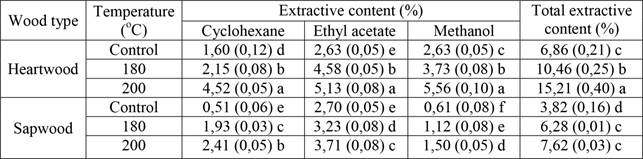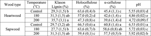 A significant interaction was found between wood type (heartwood, sapwood) and temperature for all chemical components (extractive, Klason lignin, holocellulose, and α-cellulose) and pH (Table 1 and Table 2). The untreated heartwood had a higher extractive content than the untreated sapwood. The extractive content gradually increased as the temperature of treatment increased for both wood types (Table 3). The total extractive content of treated heartwood and sapwood respectively increased by 53 % and 64 % at 180 °C and by 122 % and 100 % at 200 ºC compared to untreated woods. Similar behavior for the extractive content was observed by other authors after thermal treatments (Gašparík et al. 2019, Bellon 2013, Lengowski 2011). Gašparík et al. (2019) found an increase of 56 % on teak extractive after the ThermoWood® treatment at 210 ºC. Also, the extractive content increased by 135 % (Bellon 2013) and 158 % (Lengowski 2011) in the 160 °C-treated teak wood from VAP HolzSysteme® industrial process compared to untreated wood. However, these studies did not separate heartwood from sapwood material. The increase of the extractive content is not related to the natural extractives of wood, which are in large part volatilized during the thermal treatment, but to by-products formed mainly from the degradation of the hemicelluloses. According to International ThermoWood Association (2003), temperatures ranging from 120 °C to 180 °C increase the extractive content of wood while the temperature up to 230 °C causes a decrease in extractives.