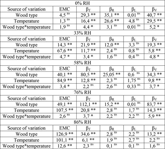 The effects of the thermal treatment were more important in βT than in βR. However, βL was not affected neither by the wood type nor the thermal treatment (Table 5). The greater dimensional variations of the wood occur in the tangential direction from 2,4 % to 11 % followed by radial direction from 3,5 % to 5 % while those in the longitudinal direction are almost negligible from 0,1 % to 0,6 % (Kollmann and Côté Jr. 1968). Several factors can explain the anisotropy of wood such as anatomical and chemical structure, mainly due to restriction of rays in the radial direction and the helical arrangement of the cellulose microfibrils in the cell wall (Kollmann and Côté Jr. 1968). Nevertheless, the relationships between anatomical structure, chemical composition, extractive content, and density cause variations in shrinkage and swelling among wood species.