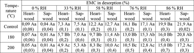Generally, the sapwood had higher EMC than the heartwood after the heat treatments (Table 6, Figure 2). This is due to the higher holocellulose and α-cellulose contents in sapwood (Table 4) which are the most hygroscopic polymers of cell walls. The higher extractive content of treated heartwood could also affect the EMC because they decrease the wood hygroscopicity.