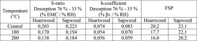 The thermal modification reduced the EMC of heartwood and sapwood at sorption conditions from 33 % to 86 % RH. The sapwood was more sensitive to RH variations than heartwood, regardless of the temperature.