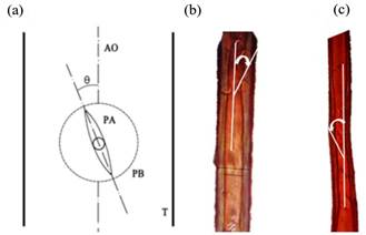 Los tarugos radiales fueron secados en estufa a 70 °C por un período de 72 horas hasta alcanzar un contenido de humedad del 12 %. Posteriormente, se pulieron los tarugos, y se tomaron muestras del leño tardío de los anillos de crecimiento 4, 7, 10 y 11 se disociaron utilizando una solución de ácido acético y agua oxigenada en partes iguales (Franklin 1937), y luego se tiñeron con safranina al 1%. Los disociados fueron observados empleando un microscopio óptico trinocular marca Nikon modelo Eclipse LV100DA-U con iluminación por luz transmitida. El sistema cuenta con una cámara digital color modelo DS-FI2-U3 cuyo software de operación para procesamiento de imágenes es NIS-Elements D versión 4.13.00 64-bit. Para determinar el AMF se empleó la técnica denominada “a través de la apertura de las puntuaciones presentes en traqueidas” (Huang et al. 1997). El ángulo microfibrilar se midió sobre traqueidas individuales seleccionadas al azar y obtenidas del leño tardío, trazando una línea paralela al eje de la misma que pase por el centro de la puntuación (Figura 1). El ángulo formado (θ) entre la línea que pasa por el centro de la puntuación y la orientación axial (AO) de las traqueidas indica la orientación de las microfibrillas (AMF) en la capa S2 de la pared celular secundaria.