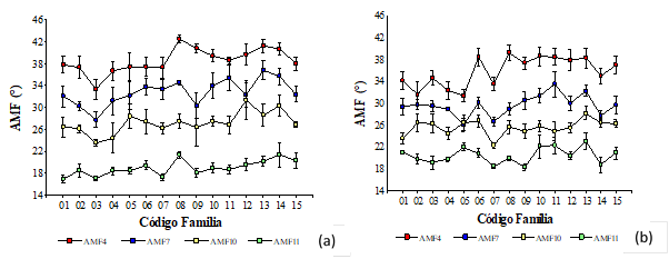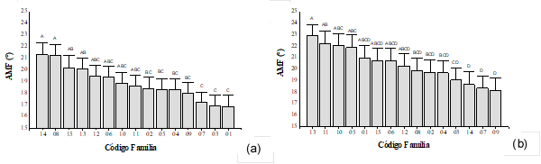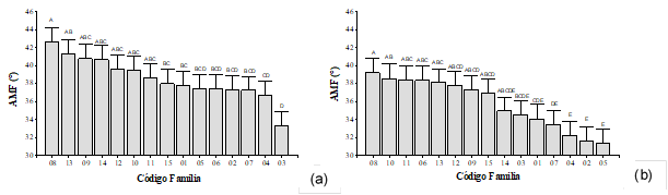 A los 4 años de edad (anillo 4), se detectaron diferencias estadísticamente significativas entre familias para el AMF en los sitios estudiados (valor-p≤0,022). Los valores medios de AMF registrados para el sitio 2 fueron menores en un 7,1% respecto al sitio 1. Los mayores valores de AMF encontrados para el sitio 1 podrían ser atribuidos a una alta velocidad de crecimiento inicial propiciado por una disponibilidad privilegiada de recursos minerales asociados al uso anterior de la tierra. Para el sitio 1 las familias con menores valores de AMF fueron la 02, 03, 04, 05, 06 y 07, arrojando un valor medio de 36,5° (Figura 2a). Por otra parte, para el sitio 2, presentaron menores valores de AMF las familias 01, 02, 03, 04, 05, 07, con una media de 32,9° (Figura 2b). Estas familias pertenecen a la posición 1 y 2 del ranking genético de crecimiento, indicando que, al seleccionar por crecimiento, indirectamente se estaría eligiendo los ejemplares con mejor desempeño en cuanto al AMF.
