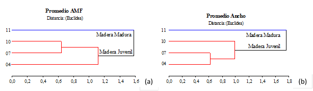 La evaluación de las características anatómicas en su conjunto es considerada de importancia, para definir un uso más adecuado de la materia prima. Sin embargo, para especificar parámetros indicadores de la calidad estructural de la madera se aconseja tener en cuenta al AMF y el espesor de pared celular como valor de diagnóstico (Donaldson 1996, Long et al. 2000, Hein et al. 2013), dado que están íntimamente relacionados con su comportamiento físico-mecánico, y por lo tanto, con su procesamiento tecnológico (Winck et al. 2015). A través del análisis de conglomerado se pudieron observar 2 regiones bien demarcadas por los valores de AMF y ancho de traqueidas, indicando la formación de madera madura a partir de los 10 años de edad (Figura 5a y Figura 5b). Sin embargo, cuando se realiza el dendrograma para el lumen, espesor y proporción de pared celular, el límite ocurre a los 7 años de edad.