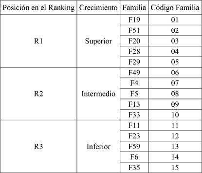 Las familias pertenecientes a la posición 3 del ranking genético, de menor crecimiento, presentaron un mayor valor de ángulo microfibrilar. Por estas dos razones no se recomienda invertir recursos en su reproducción.