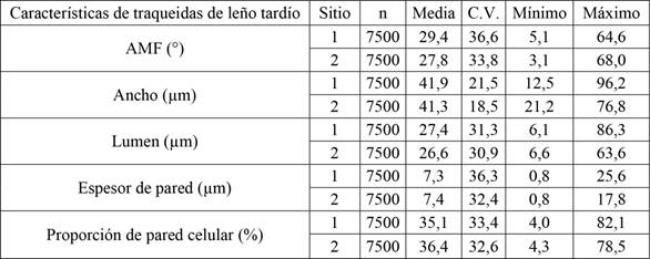 Los valores de diámetros a la altura de pecho de los árboles muestreados estuvieron entre 11,5 cm y 40,1 cm. Mientras que la altura total tomó valores entre 12,5 m y 26,8 m. En la Tabla 2 se presenta las medidas resúmenes para las características morfológicas de las traqueidas para cada sitio. El sitio 2 presentó menores valores medios de AMF, ancho y lumen de traqueidas, y mayor valor medio de espesor y proporción de pared celular; con mayor homogeneidad, representadas mediante un menor coeficiente de variación para las distintas variables.