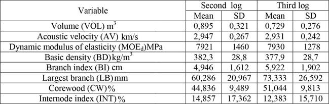 The average proportion of lumber with a static modulus of elasticity higher than or equal 8000 MPa was 37,04 % in the second log, and 31,55 % in the third log. These results could be explained by the slightly superior MOEd in third logs (Table 1). This result does not follow the trend reported by Xu and Walker (2004), who indicate that the highest MOEd would be concentrated in the second log, between 4 m to 8 m, and then decrease. The correlations between log attributes, and structural lumber production resulted according to comparable studies (Ivković et al. 2006). Thus, there was a negative and significant correlation between AV and VOL (-0,63, p < 0,05). The correlation between AV and BD was also significant (0,66, p < 0,05). The average predictor variables are similar to other reported studies (Apiolaza 2009). For instance, the maximum values of AV and LB for second and third logs were 3,59 km/s and 3,45 km/s, and 110 mm and 125 mm, respectively which are similar to those obtained by comparable studies (Xu and Walker 2004).