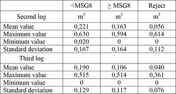 Concerning structural lumber products (≥ MSG8), at least one structural board was generated in 86 % of the second logs, and 83 % of the third logs