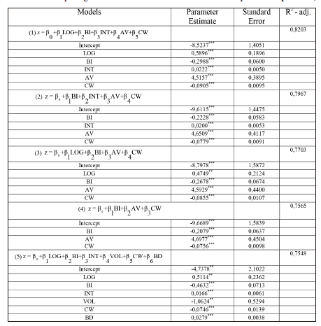 Models 1, 2, 3, 4 and 5 in Table 4 showed the best performance in terms of goodness of fit (R2 - adj > 0,75). Model 1 presented an R2 - adj. of 0,82 and all coefficients were significantly different from zero (p < 0,01). AV had a high weight to explain the variability of pMSG8+, which supports results by Jones and Emms (2010). Considering Model 1 for the second log and using the average values of the explanatory variables BI, INT, AV, and CW, the estimated value of pMSG8+ was 39 %. When increasing AV by 1 %, this proportion increased more than proportionally by 3 % because the velocity goes as a squared variable in the formula to estimate the MOEd.