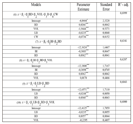 The largest branch (LB) and the branch index (BI) made an equivalent contribution across the models. This result is propitious for using LB as operative criteria to characterize logs because collecting LB information is less time consuming that determining the branch index (BI).