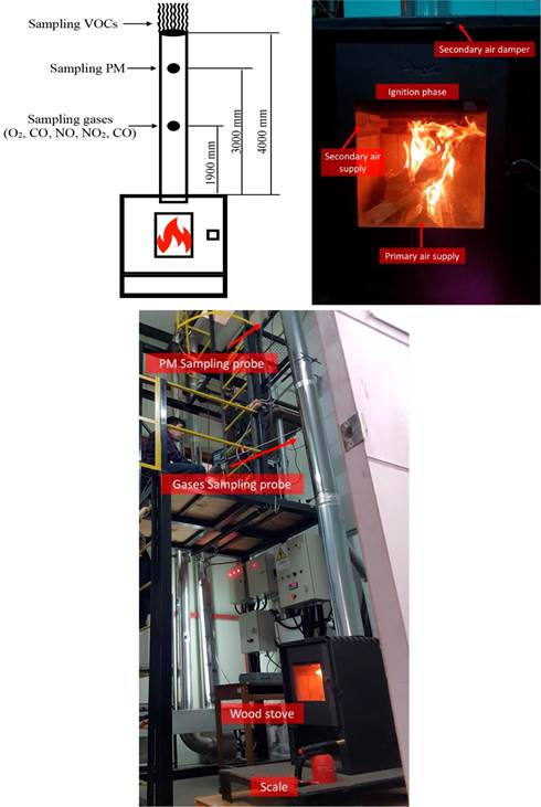 The experimental setup is shown in Figure 1. The sampling point for combustion gases was located at 1,9 m height over the stove. Additionally, the PM sampling was located at 3 m over the stove, and the VOCs samples at 10 cm over the exit of gases at the top of the duct 4 m over the stove.
