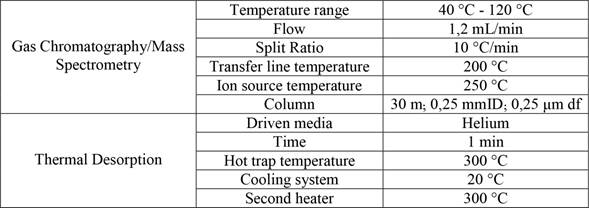 The gases were extracted in Split mode, driven with helium for 1 min to the hot trap programmed at 300 °C and then cooled to 20 °C in the cold trap to be heated to 300 °C for 5 min. VOCs were transferred employing a transfer line heated at 200 °C to one column (RESTEK-Rtx-5MS, PA, USA. w/integra-guard Crossbond 5 % diphenyl-95 % dimethylpolysiloxane. 30 m; 0,25 mmID;3 0,25 μm df) installed in a GC/MS (Thermo Fisher Scientific, model Trace 1300/ISQELTL, MA, USA). The working conditions of the GC for the oven were in Split mode with a working temperature between 40 °C and 220 °C. Flow: 1,2 mL/min; Split Ratio: 10 °C/min, the transfer line temperature of the MS detector was 200 °C while the temperature ion-source was set at 250 °C. The qualitative identification of VOCs was carried out using the Chromeleon 7.2 software package (2013), which is compatible with the NIST library (NIST Chemistry Webbook 2010), using retention times observed in the chromatograms. The experimental conditions are summarized in Table 2.