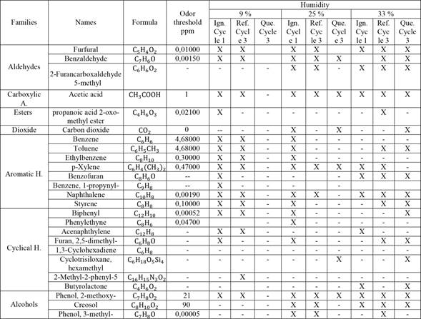 More than 150 compounds were identified in the samples analyzed, considering the moisture conditions to which the wood was exposed (9 %, 25 %, and 33 %). However, many of these compounds only appeared in one or two combustion stages (ignition, stable reload, and quenching). Furthermore, the reliability of some identified compounds was less than 98 %, consistent with the NIST library (NIST Chemistry Webbook. 2010). Therefore, the inventory of all compounds found throughout the experimental process was reduced to the compounds shown in Table 3. In Table 3, VOCs were classified by families, name, odor threshold, and their toxicity degree in humans. The compounds that were found in all the samples (18) were considered representative in terms of emissions, and these compounds constitutes around the 25 % of the total number of compounds of the samples (Hernández et al. 2019). Among the VOCs identified, benzene and related compounds represented the most abundant group (45 % - 69 %), followed by oxygenates (21 % - 39 %), and aliphatic hydrocarbons (4 % - 23 %), depending on the stage of the combustion (ignition of Cycle 1, stable reload of Cycle 3, and quenching of Cycle 3). The above results are similar to those reported by Evtyugina et al. (2014) for emissions of the three types of wood (European beech, Pyrenean oak, and Black poplar). These woods are most used in residential combustion in southern Europe in slow-combustion stoves (wood stoves), reporting that the emissions of aromatic VOCs represented between (43 % - 60 %), oxygenates (26 % - 36 %), and aliphatic hydrocarbons (9 % - 16 %). Evtyugina et al. (2014) also analyzed the combustion of these three species of wood in fireplaces, where benzene and the compounds related to this aromatic hydrocarbon continue to represent the most abundant group (43 % - 45 %), followed by oxygenated VOCs (31 % - 36 %) and aliphatic hydrocarbons (16 % - 18 %). Terpene compounds (4,5 % - 4,7 %) and halogenated VOCs (0,2 % - 0,5 %) are also highlighted as relevant VOCs. On the other hand, McDonald et al. (2000) analyzed the combustion of different types of soft and hardwood: Ponderosa pine, Pinion pine, Missouri oak, Scrub oak, mixed hardwood (cottonwood, birch, aspen), and synthetic logs. The results show that the most common VOCs in residential wood combustion are ethane, acetylene, ethene, benzene, toluene, formaldehyde, and acetaldehyde. Many of these compounds match with those reported in Table 3.