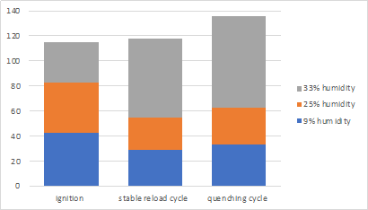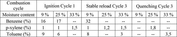 Table 4 shows the trend in the ratio of benzene, toluene, and xylene at different moistures and in the different combustion stages of Eucalyptus globulus wood. It can be observed that in the ignition and stable reload stages, there is the presence of benzene (16 % and 32 %) and toluene (9 % and 8 %) for 9 % wood moistures, while in the final quenching stage, benzene and toluene disappear for all samples (9 %, 25 % and 33 %). Special attention is paid to xylene, which as the wood moisture increases (9 %, 25 % and 33 %), its composition increases in the ignition and stable reload stages. In contrast, in the quenching stage, it practically disappears. A study carried out by Guerrero et al. (2019) shows that the combustion emissions of Eucalyptus globulus Labill increase PM 2,5 and polycyclic aromatic hydrocarbon by 11,4 % and 1,46 %, respectively, when they are at 25 % moisture compared to the same wood at 0 % moisture.