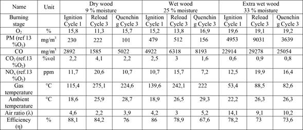 Table 5 shows the behavior of the PM, moisture, and other combustion gases (CO, CO2, NOx) emitted in the different stages of wood combustion. It can be observed that as the moisture of the wood increase also increase the PM emissions.