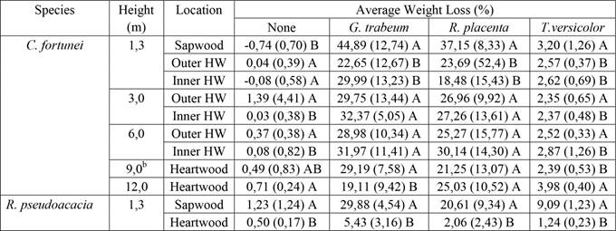 Weight losses of C. fortunei sapwood bocks exposed to G. trabeum or R. placenta averaged 44,89 % and 37,15 %, respectively, indicating that the wood had little resistance to fungal attack. Weight losses were extremely low with T. versicolor, which is consistent with the tendency of white rot fungi to have less effect on coniferous species. Weight losses for inner and outer heartwood of C. fortunei were generally lower than those found with sapwood, but almost all were over 20 % for the brown rot fungi. American Wood Protection Association Standard (AWPA 2017) E30 provides a relative guide to heartwood decay resistance with weight losses between 10 % and 25 % classified as resistant, while those between 25 % and 44 % are moderately resistant to decay (AWPA 2017). The results indicate that C. fortunei was resistant to moderately resistant to brown rot attack; however, variations in weight losses between individual blocks were extremely high, with coefficients of variation ranging from 15,6 % to 83,5 %. This suggests that it would be prudent to classify this material as only moderately durable. These results would concur with the wide range in decay resistance suggested for C. japonica (Scheffer and Morrell 1998). Previous studies have suggested that more recently formed heartwood as well as heartwood nearer to the base of the tree tend to be more decay resistant to decay (Taylor et al. 2002). However, there was no evidence of those differences in the current study, possibly because of the extreme variation in weight losses.
