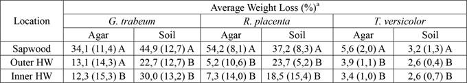 The 19 mm blocks were briefly soaked in water and then sterilized by autoclaving for 20 minutes at 100 °C. The authors recognize that exposure to excess heat can reduce heartwood durability, but alternative methods were not available (Scheffer and Cowling 1966, Taylor et al. 2002). The heating times were limited as much as possible to minimize this risk. Decay chambers were prepared by half-filling 450 mL French squares with moist forest loam and placing a pine sapwood (Pinus sp) (for brown rot fungi) or Paulownia fortunei (for white rot fungi) feeder strip on the soil surface. The bottles were loosely capped and autoclaved for 45 minutes at 121 °C. After cooling, the bottles were inoculated with 3 mm diameter malt agar disks cut from the actively growing edges of cultures of Gloeophyllum trabeum (Pers.ex. Fr.) Murr. (Isolate # Madison 617), Rhodonia placenta Niemelä, Loss & Schigel (Isolate # Mad 698), and Trametes versicolor (L. ex Fr.) Pilát (Isolate # R-105). The former two fungi produce brown rot, while the latter produces white rot. Sterile test blocks were placed on the surfaces of the feeder strips once the test fungus had grown, and the bottles were incubated at 28 °C for 12 weeks for the brown rot fungi or 16 weeks for T. versicolor. Twelve blocks were evaluated from each tree and position for each decay fungus. Non-fungal exposed controls were included to provide a measure of the weight losses occurring from block handling.