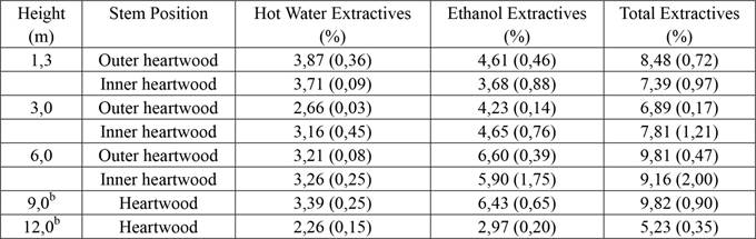 Extractives levels dropped sharply 12 m above the ground, but it is important to note that the diameters at this height were very small as heartwood was just forming. Scheffer and Cowling (1966) suggested that heartwood extractives content should be highest near the base of the tree and decline with height. They also suggested that heartwood extractives should be most active near the heartwood sapwood interface. The results with Chinese cedar do not support either premise.