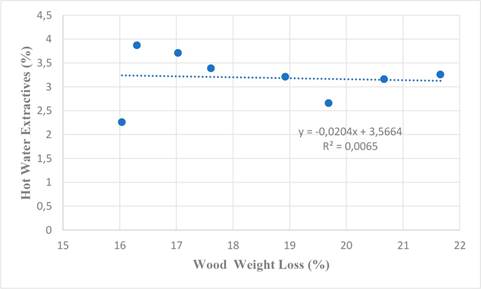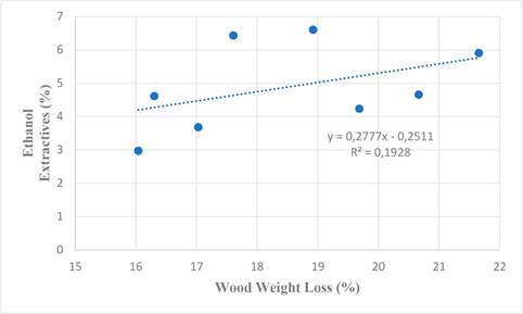 The fungal weight loss data were subjected to an Analysis of Variance and then the resulting means were examined using Tukey’s HSD test (α=0,05). Extractives contents varied widely and there was no consistent pattern with stem location. The potential relationship between extractives content and fungal associated weight was instead assessed by plotting the data and determining linear correlations.