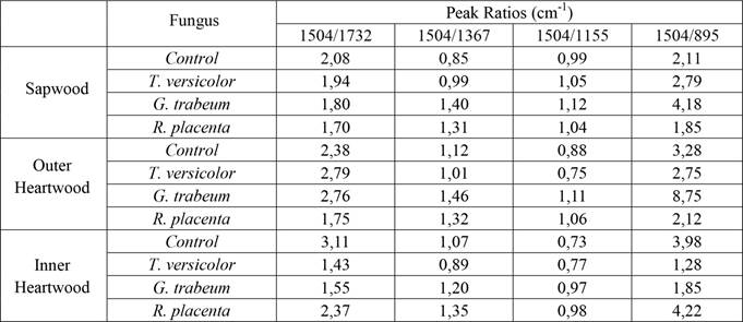 FTIR analysis of inner and outer heartwood samples tended to be less uniform. For example, 1504/1732 cm-1 ratios for outer heartwood samples exposed to G. trabeum were slightly higher than those for the control while those for samples exposed to R. placenta were slightly lower. Ratios for 1504/1367 cm-1 and 1504/1155 cm-1 were both higher for samples exposed to one of the brown rot fungi, which would be consistent with selective carbohydrate utilization. Similar trends were noted with inner heartwood. One problem with the FTIR results is the high variability in weight losses among the blocks. Combining materials results in a mixture of materials with a range of degrees of fungal damage. This would have masked larger differences that might exist between blocks.