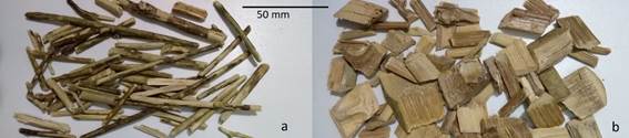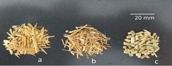 Figure 1 shows the bamboo chips and mate sticks, which have been milled in forage chopper. Mate sticks were obtained from thin branches, usually cylindrical in shape, with a maximum diameter of 7,5 mm and varied length in the wet condition. After processing and drying, the average dimensions were 3,4 mm and 39,7 mm, diameter and length, respectively.
