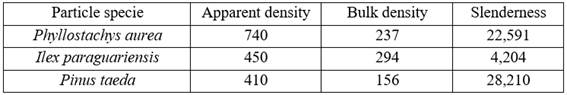 The ground material of mate and bamboo chips was subjected to the sieve classification and physical properties determination: bulk density, apparent density and slenderness ratio. Tyler series classification of bamboo and mate particles using a sieve shaker were performed by subjected to mechanical agitation for 15 minutes, using those that passed through the 8 Tyler mesh sieve (2,362 mm) and were retained in the 12 Tyler mesh sieve (1,397 mm). In addition, commercial Pinus taeda particles produced in a local MDP panel industry and of the same granulometry were used.