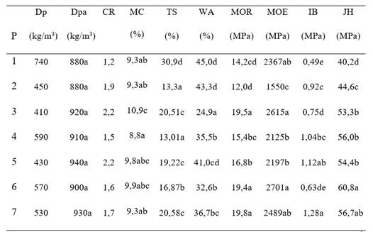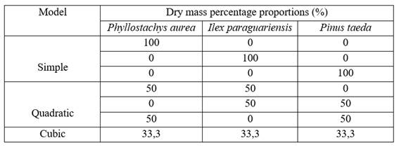 The experimental design consisted of seven panels type: pure specie material, mixtures between two or even all materials (Table 2). In the evaluation, the three models (simple, quadratic and cubic) were tested for all properties analyzed, and the non-significant coefficients were discarded by the “t” test.