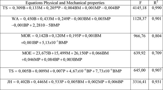 In Table 4 were presented the simplified equations in which the non-significant coefficients were discarded by Student's t-test for the mechanical properties of HDP panels.