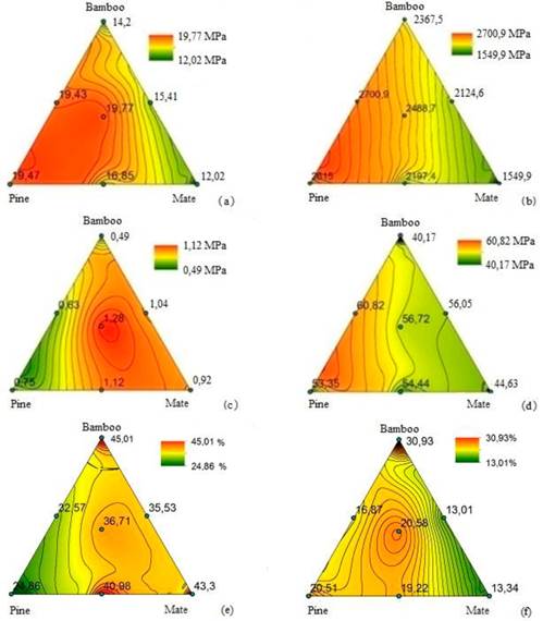 Internal bond strength presented higher estimates for mate compared to bamboo. The coefficient of quadratic interaction was significant and positive in the mixture of 50 % bamboo and 50 % pine and there was triple and positive interaction.