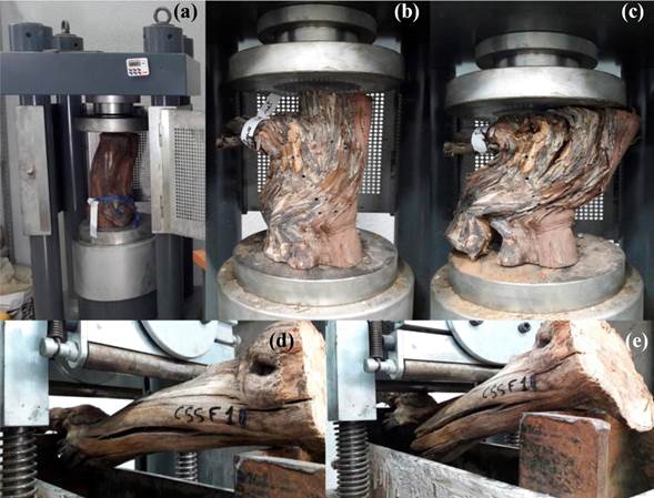 Vertically placed trunks were used to simulate the compressive strength suffered by the vine trunks in field conditions, with both end surfaces cut perpendicularly to the axis of the sample (Figure 1a).