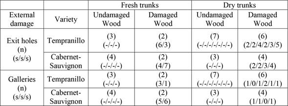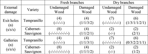 Up to a maximum of 6 exit holes/sample (Tempranillo) and 6 larvae galleries/sample (Cabernet-Sauvignon) were found in fresh damaged samples. Meanwhile, up to a maximum of 5 exit holes/sample (Tempranillo) and 2 larvae galleries/sample (Cabernet-Sauvignon) were found in dry damaged samples (Table 1).