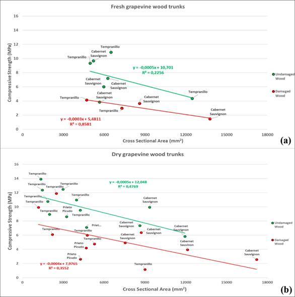 CS and FS decreased with the increase in the CSA irrespective of the part of the plant (branches and trunks), damage condition (undamaged and damaged) and water content (fresh and dry), significantly more accentuated in damaged than in undamaged wood. It was also verified through the linear regression coefficients of the CS x CSA interaction that significant differences between undamaged and damaged grapevine wood samples showed up in fresh trunks, dry trunks and fresh branches. The grapevine wood is subjected to severe pruning during the entire growth period to build up a defined training system. However, this pruning causes a non-uniform growth of the wood fibers, promoting the appearance of knots and cracks in the wood, which will directly affect the strength and resistance of the wood. Therefore, this fact will explain the decrease in both CS and FS as the CSA rises in undamaged wood samples because older wood has been subjected to more pruning cuts throughout its life. Moreover, a greater CSA implies that a more significant volume in timber could be attacked by X. arvicola larvae. This agrees with the decrease in both CS and FS as the CSA increases in damaged branches and trunks (fresh and dry). This would explain the downward slope of the trendline for the linear regressions obtained for fresh and dry trunks, and fresh branches, all whose wood samples had CSA greater than 2000 mm2, as Rodríguez-González et al. (2019) already observed in wood varieties. On the other hand, dry branches with a CSA lower than 2000 mm2 in all the samples, did show a trendline with an upward slope for the linear regressions afore mentioned. Thus, wood samples with a smaller CSA had few galleries inside the wood, so the resistance of the wood was not severely damaged. Previous studies carried out by Rodríguez-González et al. (2020) only allowed us to conclude that the vine wood damaged by these larvae had a lower resistance and a higher breaking speed than undamaged wood.