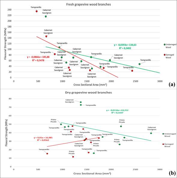 Therefore, the objective of this study was to examine the mechanical behaviour of grapevine wood from trunks and branches affected by X. arvicola larvae using wood samples with different section area and from different V. vinifera varieties. Also, the total length of the cracks that appeared in the wood samples (TLCWS) after performing the mechanical tests was measured.