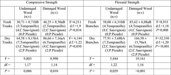 Two standard strength experiments: compressive tests for wood trunks and flexural tests for branches were performed in order to analyse the mechanical behaviour of grapevine wood, from selected V. vinifera varieties, damaged by X. arvicola larvae.