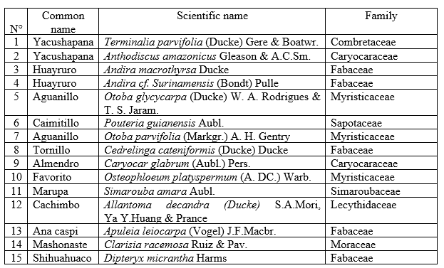 Due to the huge number of lesser-used tree species in the Amazonian part of the Peruvian forests and due to the limited resources in terms of time and manpower, a selection of species had to be carried out to conduct the research tasks. In this study, a multi-criteria decision analysis approach (Saaty 1990) was used for the selection process of 15 species out of several hundreds. First, a long list of selection criteria was set up. The five most important criteria and the associated weighing factors were defined by five experts attending a consensus meeting. The selection criteria and the corresponding weighing factors were: frequency of occurrence (30), lack of physical and mechanical information (30), possible implications for local markets (15), possible importance for export (15), and market price (10). The numbers in round brackets are the weighting factors (sum = 100). The experts rated the five criteria for each of the species on the list by giving up to 10 points (0 = not relevant, 10 of utmost importance) to each criterion. Multiplication of points with weighing factor yielded the total score (max = 1000). For this study, the 15 species with the highest scores were selected. To make sure that the natural variability between different trees and in individual stems is considered in the determination of the wood properties, the test material for production of the specimens had to comprise: sections from at least three different trees, sections from butt and middle locations in the stem, specimens taken from both, sapwood and heartwood, no previous treatment with preservatives, no prior drying at elevated temperatures. The list of selected species is presented in Table 1.