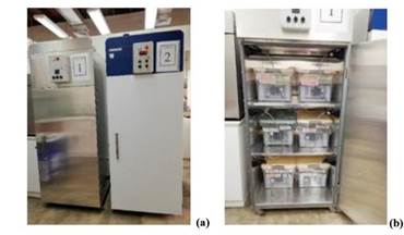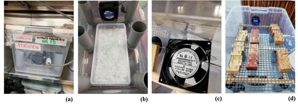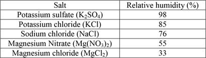 Climate chambers are indispensable to determine wood/water relations. However, climate chambers are expensive due to high cost for investment, maintenance and energy. In order to conduct the investigation in a reasonable time span, several climate chambers were required to provide different climate conditions at the same time. As neither several climate chambers nor sufficient funds for purchasing additional chambers were available, two insulated chambers with internal air circulation and temperature control were allocated in a laboratory room with well controlled temperature. In each chamber six small, and hermetically sealed, removable containers were positioned. Each container was equipped with a small fan for internal circulation of air. The relative humidity of the circulating air was conditioned by means of a basin filled with a saturated salt solution placed at the bottom of the container. The wooden samples were positioned on a rack approximately 4 cm - 5 cm above the surface of the saturated salt solution. By keeping the temperature of the chamber constant and keeping the salt solutions in saturated condition, various constant relative humidity (RH) conditions could be provided at the same time. Figure 1 shows the overall setup, Figure 2 the design of the small climate containers. In Table 2 the salt solutions used and their corresponding relative humidity are listed.
