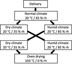Oven drying according to ASTM D4442-20 (2020) at the end of all climate steps was applied to calculate moisture content (MC) at various climate conditions.