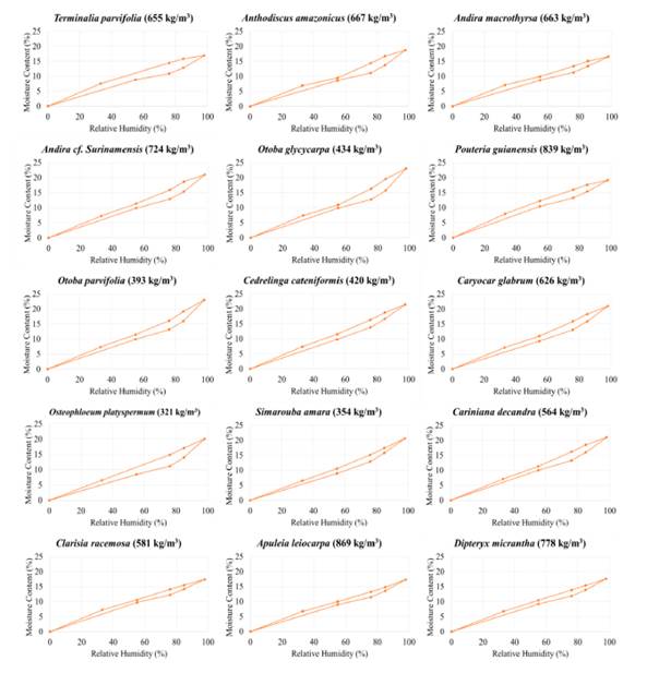 According to standard procedures, scanning sorption isotherms at 23 °C+/-2 °C were determined by exposing small specimens (20 mm x 20 mm and 6 mm in longitudinal direction) to a series of constant climate conditions starting with an average moisture content (MC) of approximately 12 %. For each species 10 specimens were tested (n=10). Absorption was carried out in several absorption steps ending at 98 % relative humidity (RH), followed by various desorption steps ending with 33 % RH. Finally, after determination of the oven dry weight of the samples, the equilibrium moisture content of the samples at the end of each climate step was calculated and the sorption isotherms were visualized.