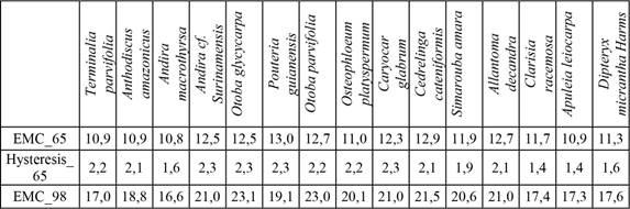 Figure 5 shows the sorption isotherms of the 15 Peruvian wood species included in the investigation comparing the results achieved by the standard method. All sorption isotherms show the typical shape of isotherms of hygroscopic materials. Between approximately 35 % and 85 % a hysteresis between absorption and desorption is visible. The hysteresis determined in our experiments ranged between 1,6 % and 2,6 % at 65 % relative humidity. These average hysteresis values are lower than those reported by other researchers (Fredriksson and Thybring 2018, Simo-Tagne et al. 2016) who determined sorption isotherms of other wood species. This probably is due to the fact that in our experiments some fluctuations in temperature and relative humidity could not be avoided. As a consequence, our desorption and absorption lines did shift towards the mean line between de- and absorption. In the lower range of relative humidity (until approx. 55 %) all species examined showed almost the same behavior. The mean values between desorption and absorption at 65 % relative humidity (EMC_65) and 98 % humidity (EMC_98) are listed in Table 3. Pronounced differences between the 15 species are only present at higher relative humidity (98 %). Here the equilibrium moisture contents (EMC) vary between 16,6 % (Andira macrothyrsa) and 23,0 % (Otoba parvifolia).