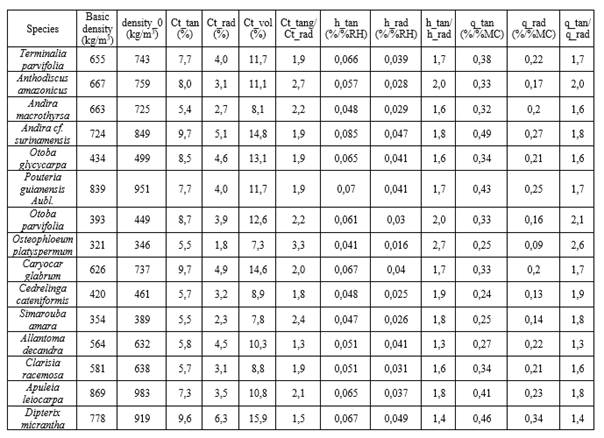 Table 4 lists the results of the various properties describing the shrinkage characteristics of 15 Peruvian wood species. In many cases documentation for lesser-used species only provides information about maximum shrinkage values in tangential and radial direction. Sometimes, only information on volumetric shrinkage without differentiating the anatomical direction is provided. For practitioners the use of h- and q-values is more important as its use is to predict the dimensional changes of wooden parts during usage. The ratio of tangential and radial characteristic values is a good measure for anisotropy and dimensional stability. Low absolute shrinkage values in combination with low tang/rad-ratios characterize wood species with excellent dimensional stability, while high tan/rad-ratios indicate a high propensity for distortion and dimensional change under use conditions in regions with pronounced fluctuations of relative humidity (e.g. low indoor RH in winter due to central heating or RH variations due to alternating dry and humid seasons). Low equilibrium moisture contents at high relative humidity combined with good dimensional stability qualify species for high quality indoor and outdoor applications.