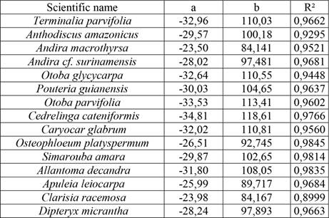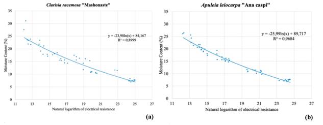 In Table 5 the regression parameters of the functional relation between electrical resistance and wood moisture content for 15 Peruvian lesser-used species are presented. In Figure 6a and Figure 6b examples of the graphical presentation of measured values and the corresponding curve fitting is shown for the two species Clarisia racemosa (Mashonaste) and Apuleia leiocarpa (Ana caspi). What can easily be seen from the graphical presentation is that there is some scattering of values around the regression curve, even though the correlation coefficient R2 is very high. This scattering reflects the natural variation of electrical properties, both within a species and between individual specimens, due to the varying location in the stem and sapwood/hardwood fraction.