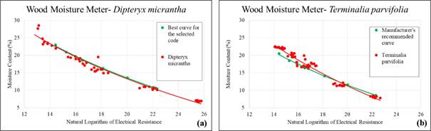 Figure 7 shows two examples of species for which (a) an almost perfect fit between instrument setting and functional resistance /moisture content relation could be found, while for (b) the best fitting instrument setting or code only results in good moisture content values around 12 % moisture content. Using a non-appropriate instrument setting will result in false moisture readings.