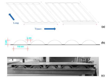 Figure 1 shows a drawing created in AutoCAD® software with the perspective and profile of the lower part of the mold (with its main directions) and a real image of the mold in profile. The technical justification for the use of this geometry (shape) of the core is that the arc-shaped structures (continuous arches) have a mechanical behavior of transferring stresses and strains mainly by compression (simple normal stress) (Nunes 2009). This fact may be beneficial for the gain of resistance in sandwich-type structures, which is the object of experimental observation in this study. Another important factor is that this type of configuration of the core avoids the occurrence of voids during the pressing (shaping) phase of the panel, as reported in the work of (Pozzer et al. 2020) when using a trapezoidal core.