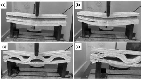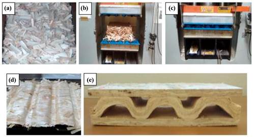 For the production of the flat panels and the undulated core, the methodology described by (Barbirato et al. 2018) was used. The PU-castor resin in the content of 13 % of the dry mass of the particles was used following the optimized result obtained in the work of (Lopes Júnior et al. 2021) and mixed with the wooden strands by means of spraying in a rotary mixer. The particles were arranged in three layers perpendicular to each other (faces perpendicular to the core) and mass distribution in the ratio 30:40:30 (face: core: face). Then, the particle mattress was inserted in a thermo-hydraulic press (Hidral-Mac® model PHH-VB, Laboratory of Construction and Ambience, Faculty of Animal Science and Food Engineering, University of São Paulo - Brazil) and pressed at 3 MPa, for 10 min at 100 °C. A metal limiter was used to guarantee the final thickness of the panels approximately 1,0 cm. After 72 hours of curing in room temperature, the faces were fixed to the core by means of bonding using PU-castor resin.