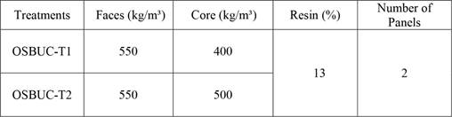 Figure 2 illustrates the production process of the OSBUC panels. Table 2 shows the experimental plan in which different densities were used for the cores of the panels in order to obtain a lightweight product with mechanical properties that allow its application in civil construction.