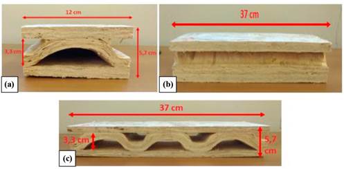 The OSBUC sandwich panels produced after hot pressing and cutting the edges were 36 cm x 37 cm. Samples were taken from the manufactured OSBUC panels with dimensions of 12 cm x 37 cm (width x length) in both panel directions (longitudinal and transverse) (Figure 3a, Figure 3b and Figure 3c). The width of the specimens was adjusted according to the geometry of the undulated core so that the cross-section of each longitudinal specimen included a cut (undulation) repeated in the direction of the transverse axis of the panel, covering an entire cell of the core (Figure 3a). The maximum dimensions for non-standard samples recommended by ASTM C393 (2016) were respected. Three specimens were used for each type of mechanical property evaluated.