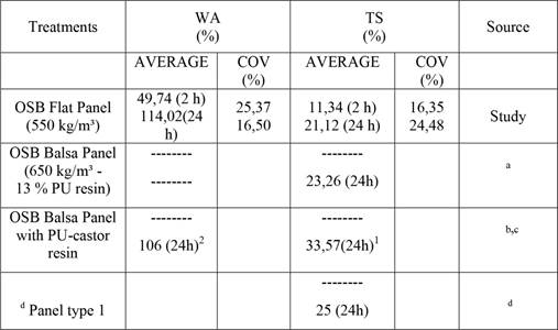 The main values and the respective coefficients of variation of the physical properties of WA and TS for flat panels are shown in Table 3. The results of WA and TS were compared with maximum values indicated by the standard EN 300:2006 (2006) and with values obtained for similar panels present in the literature.