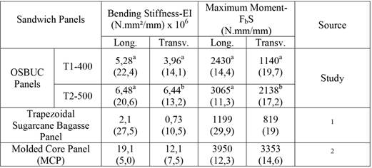 Pozzer et al. (2020) evaluated sandwich panels with a trapezoidal core consisting of sugarcane bagasse particles bonded with two-component castor oil polyurethane resin. Panels were produced with two different treatments and the best results for flexural stiffness and maximum longitudinal and transverse moment are shown in Table 5. The residual Balsa wood panels (OSBUC - T1 and T2) showed properties superior to those obtained by Pozzer et al. (2020).