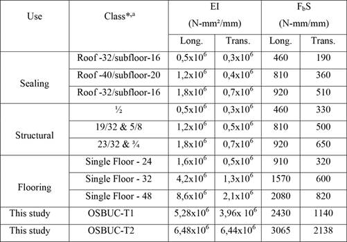 Table 6 shows the average values of bending stiffness (EI) and the maximum bending moment (FbS) and the indicative values of the APA document PS-2-10 (2011), which establishes minimum requirements for the application of OSB panels as constructive elements.